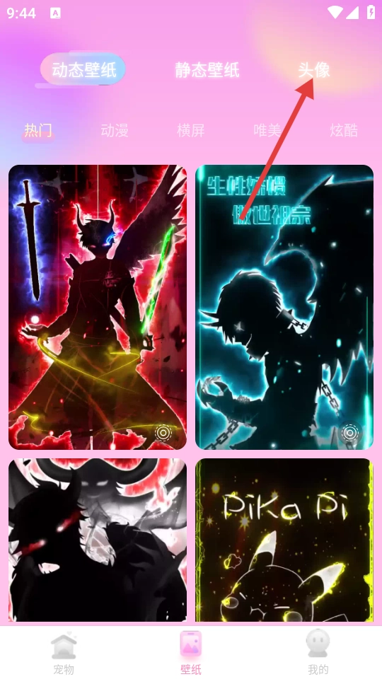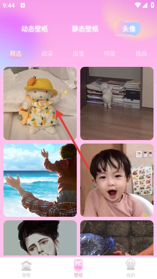 在壁纸页面,点击【头像】分类,就能浏览精选、动漫、闺蜜等各类风格的头像内容。