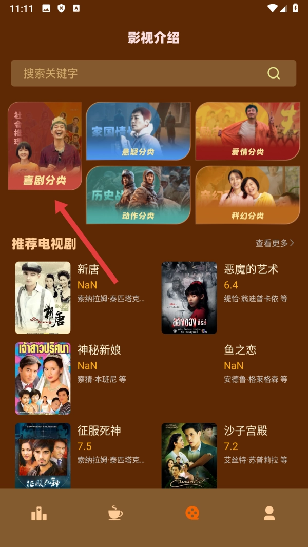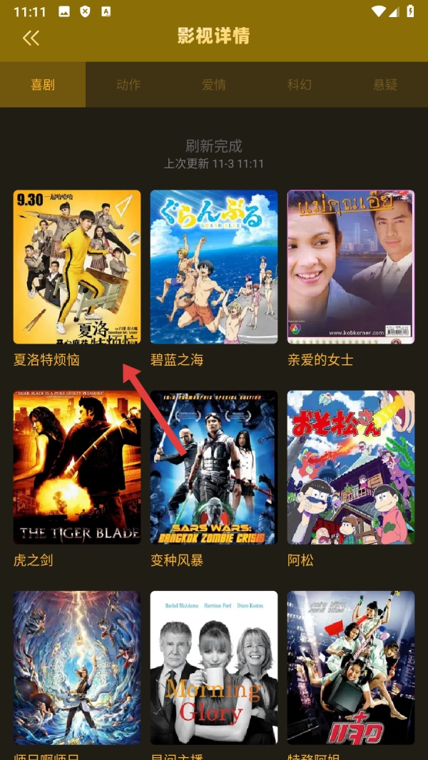 在影视介绍页面,点击【喜剧分类】选项,即可进入影视详情页面。