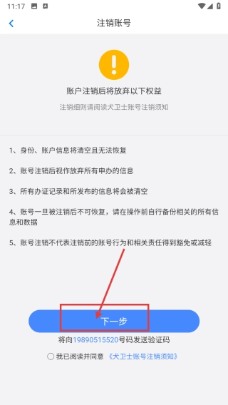 在账号注销须知页面,仔细阅读并了解账号注销后将放弃的各项权益以及相关风险提示,随后点击“下一步”按钮,按流程完成账号注销的操作。