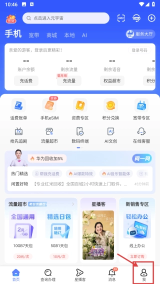 打开电信服务类的首页后,点击页面底部的“我”选项,即可进入个人中心页面。