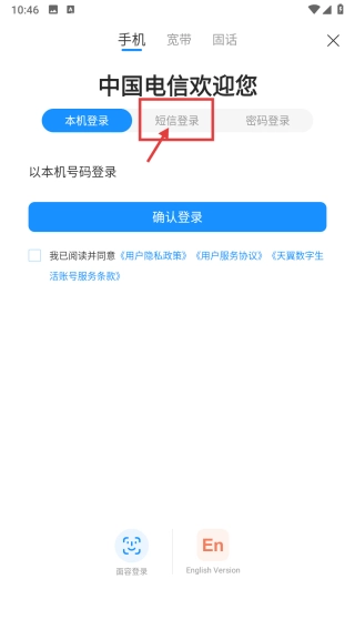 在登录方式选择界面,点击短信登录选项,即可进入短信登录信息填写页面。