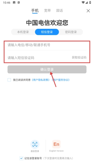 在短信登录界面,先填写手机号码,接着获取并输入短信验证码,再勾选同意用户服务协议,最后点击确认登录按钮,即可完成账号登录流程。