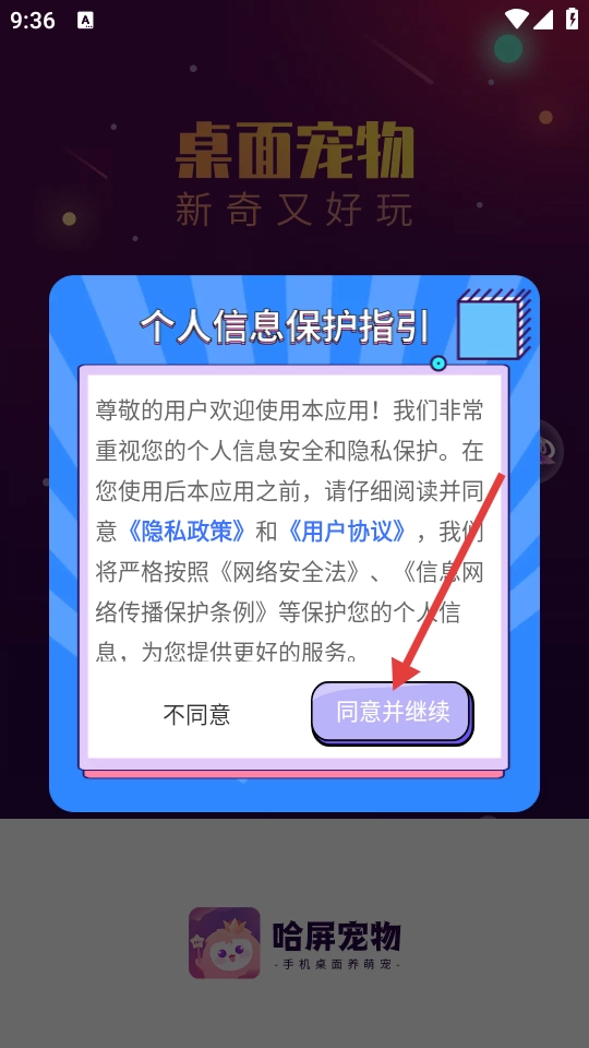 在个人信息保护指引弹窗里,点击【同意并继续】按钮,就能进入应用的主界面了。