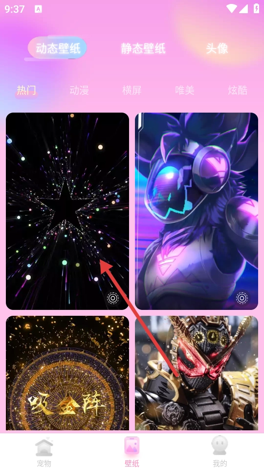 在壁纸页面,挑选心仪的壁纸,比如动态壁纸里的星光类款式,点击进入该壁纸的详情页面。