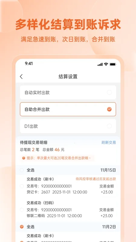 商家认证:上传商家身份相关资料信息以完成认证流程;2、设备管理:在管理中心对收银机具设备进行绑定操作,以便于后续使用;3、收款管理:支持查看收款数据情况,并可对收款方式进行设置;4、急速到账:提供自动实时出款和自助合并出款两种设置选项。
