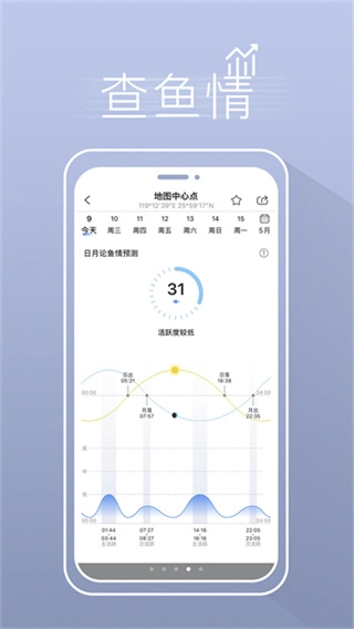 软件内支持查询未来一周的天气和海况预报,还能直观且详尽地呈现一天中每个小时的天气状况,帮助用户轻松掌握鱼类的活动趋势。