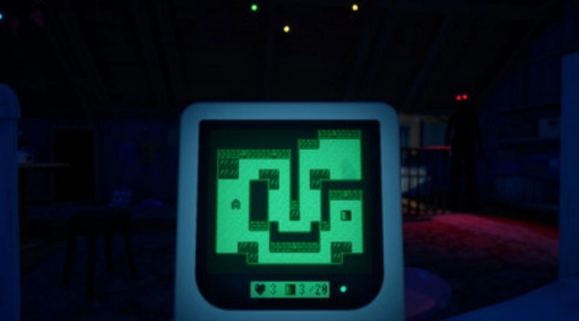 突然断电时,屏幕绿光一阵闪烁,伪人妈妈因此短暂失明,可在黑暗中摸索操作又很容易误触发出声响。