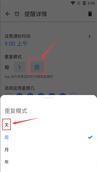 在【管理提醒】页面点击【在您开始一天前】选项。
