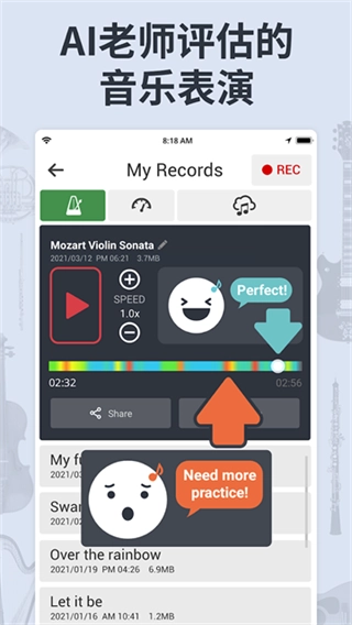 这里可以借助语言记录器来留存自己每次的音乐作品,录制好的音频能够随时收听。