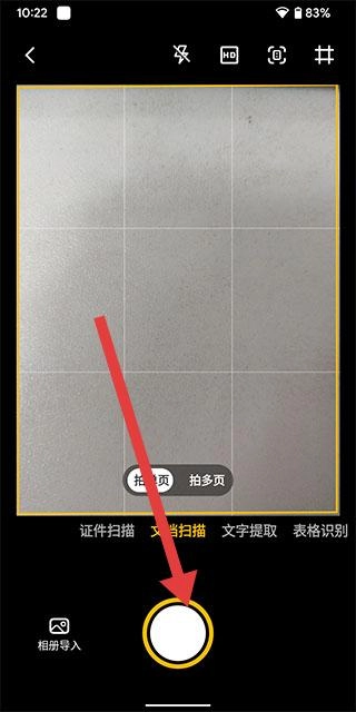 扫描界面布局简洁又实用,顶部设有闪光灯、滤镜等功能按钮,中间的取景框能精准定位文件,底部醒目的拍照大圆钮旁,还配有拍多页和相册导入功能。