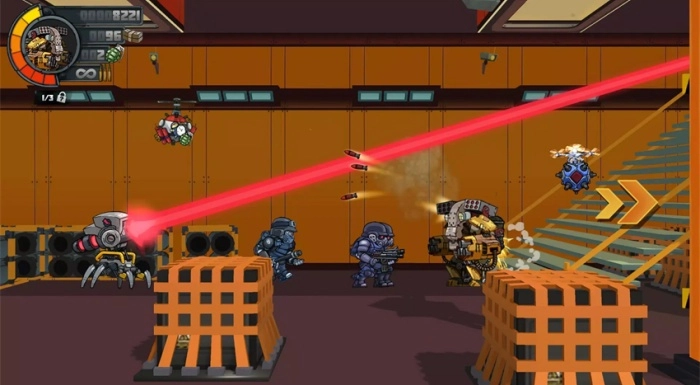 《金属战士4》中文版是一款横版动作射击游戏,玩家能够自由地奔跑、跳跃、翻滚与射击,通过击败敌人来获得奖励,这些奖励可用于强化和升级武器,让武器具备AOE伤害的能力。该游戏的免费版本采用横版动作射击机制,关卡设计融入了平台跳跃、敌人突袭、机关解谜等多种元素,画面制作精良、操作手感顺畅,提升了游戏的可玩性与挑战性。游戏设有极为丰富的角色系统,每个角色都有着不同的技能与武器设定,例如身手敏捷的匕首战士、扛着重型武器的火力猛士等。玩家还可以解锁多种载具和支援单位,像动力机甲、战斗坦克以及自动无人机等,借助它们的力量横扫敌军。