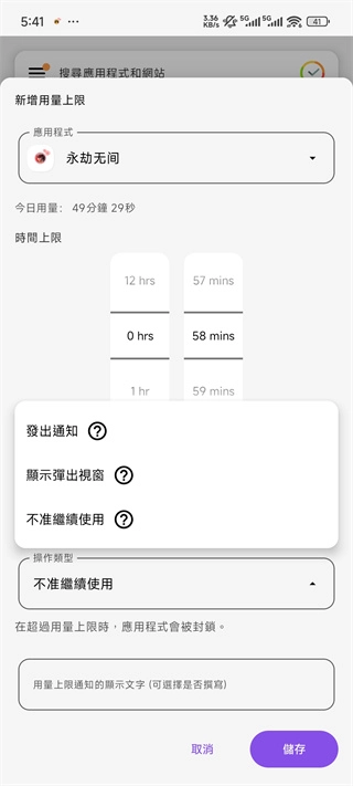 设置好上限时间后,在【发出提醒、显示弹出视窗或者不准继续使用】这几个选项里选一个,最后点击储存就完成了。