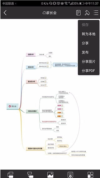 若要把已存于个人云的导图保存到手机本地,可在编辑界面点击右上角的工具按钮,选择“转为本地”,这样就能将文件转存至手机本地存储空间。