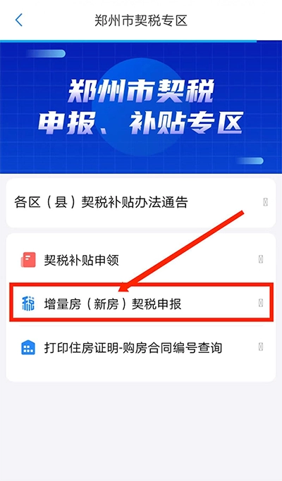 进入【郑州市契税专区】界面后,点击选择【新房契税申报】这一选项。