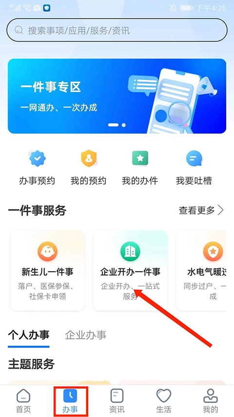 打开郑州政务服务网,进入【办事】界面,选择【企业开办一件事】选项,