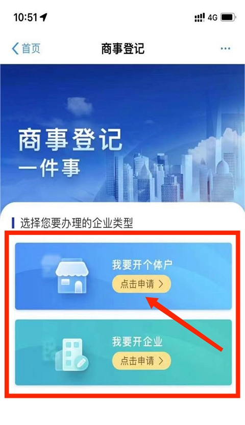 进入商事登记界面后,能申请办理个体户或开办企业,用户依据自身需求选择就行。这里我们以个体户为例,选择“点击申请”这个选项。