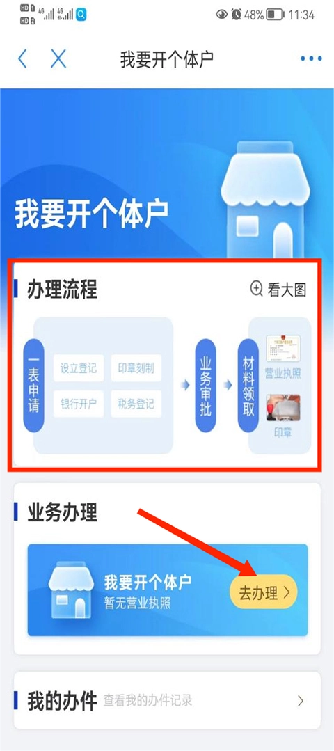 进入【我要开个体户】界面后,用户能在页面上方查看详细的办理流程,随后选择【去办理】选项即可。