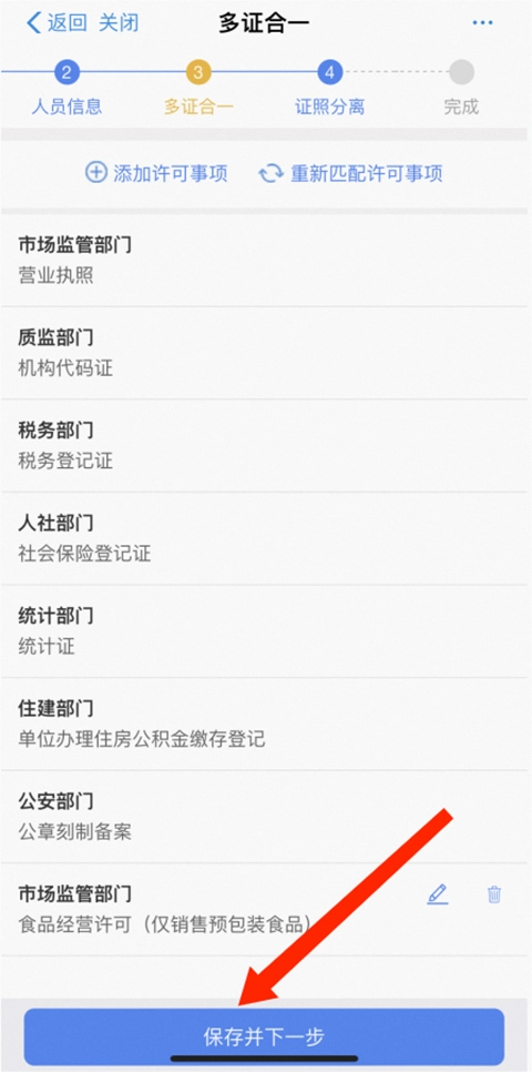 进入【多证合一】界面,填写完毕后点击下方的【保存并下一步】选项,待审核通过,即可顺利完成营业执照的办理。