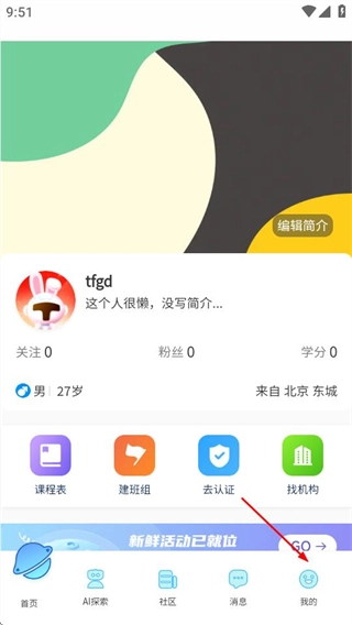 在学会首页,点击右下角我的选项,进入个人页面。