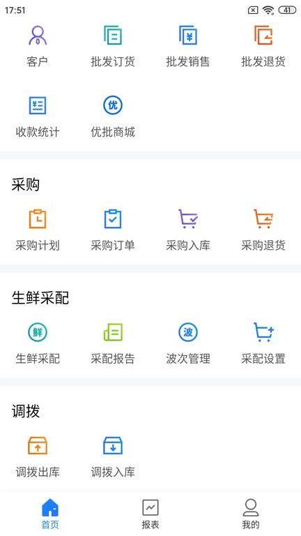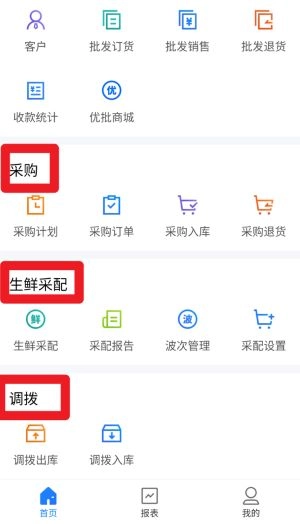 在首页下滑即可看到采购、生鲜采配、调拨等功能模块,通过这些模块能够开展采购计划制定、商品入库以及生鲜波次管理等操作。