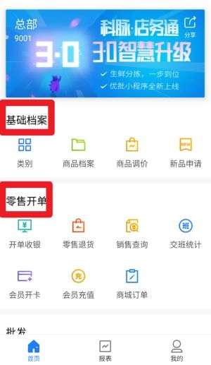进入首页后,点击基础档案、零售开单等模块,就能开展商品类别、新品申请、商品调价等基础资料的管理工作。