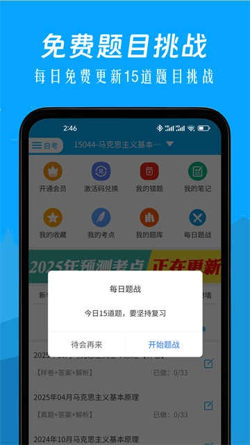 自考赢家是专门为自考生设计的智能学习工具,整合了多年积累的考试真题资源,覆盖范围广泛,能够帮助用户在海量题库中精准找到历年考点。团队会持续关注政策变化和学科更新情况,保证内容紧跟时代步伐,及时同步最新的考试动态和热点知识。“我的错题”“我的笔记”“我的考点”等个性化功能板块,可以助力用户高效整理薄弱部分,逐个攻克知识盲区。