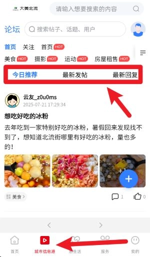 在城市信息港板块里,点击今日推荐、最新发帖、最新回复这几个选项,就能浏览本地网友分享的热门动态以及他们的交流内容啦。