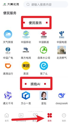 在服务页面里,你既可以使用天气、电力、水务这类便民服务功能,也能进入拥抱AI专区去使用智能助手。