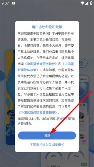 在用户协议与隐私政策的弹窗里,点击“同意”按钮,即可进入首页。