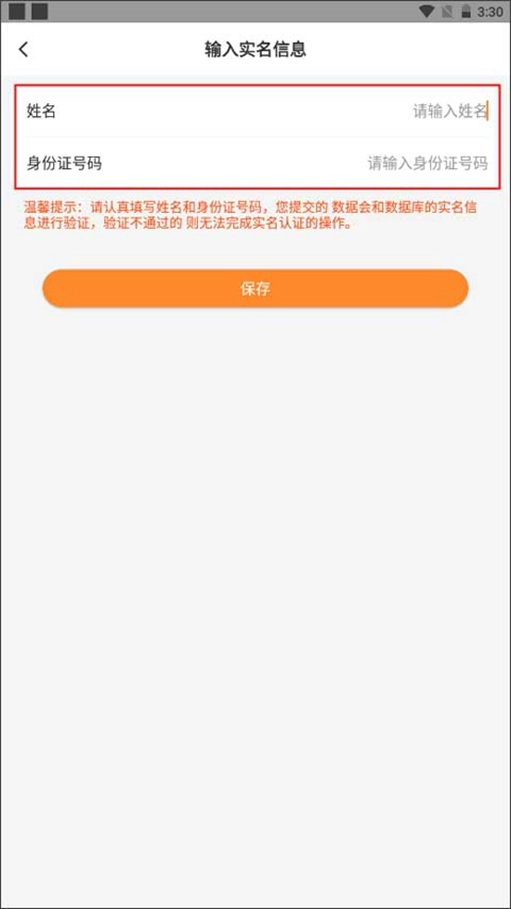 请输入您的身份证姓名与号码,完成后点击下方的保存按钮,即可提交成功。