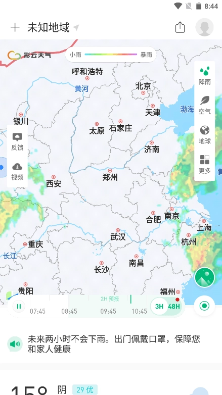 彩云天气能够在手机地图上流畅呈现整个城市的降雨量动画效果。