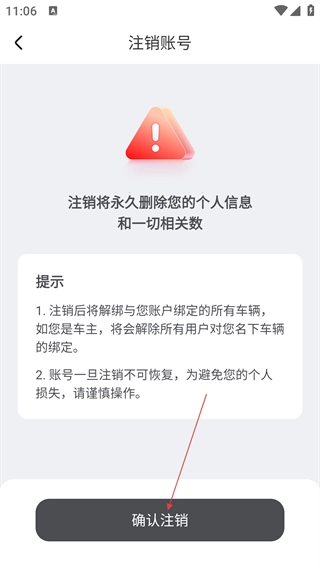 在注销账号说明页面知晓注销带来的后果后,点击【确认注销】按钮即可完成账号注销流程。