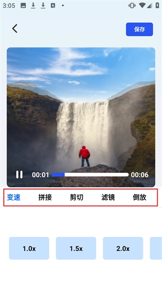 在变速编辑界面,能够选择【1.0x】【1.5x】【2.0x】等速度档位来调节,调整好之后点击【保存】按钮就可以了。