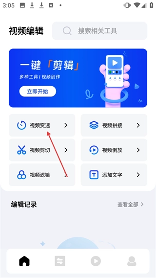 在视频编辑界面中,点击【视频变速】选项,即可进入选择视频的环节。