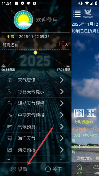 在健茂天气首页,点击左上角的三条横线图标,就能展开侧边菜单。