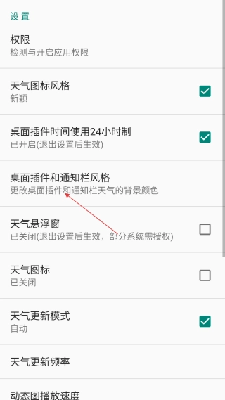 进入设置界面后,找到并点击【桌面插件和通知栏风格】选项,即可进入天气小部件与通知栏的设置界面。