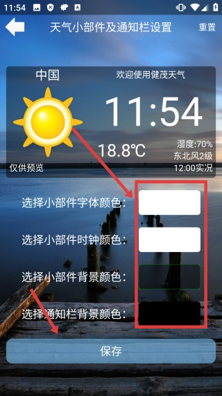 在天气小部件和通知栏的设置界面中,先点击【选择颜色】选项,接着点击【保存】按钮,这样就能完成主题风格的设置操作了。