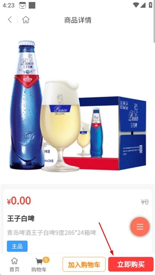 在白啤的商品列表页面,找到并选择王子白啤,随后进入该商品的详情页面。