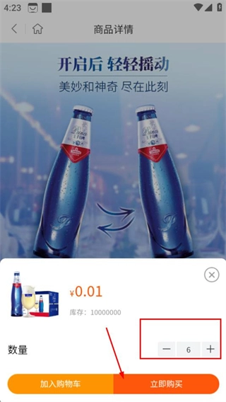 在商品详情页,点击“立即购买”按钮后,选择想要购买的数量。