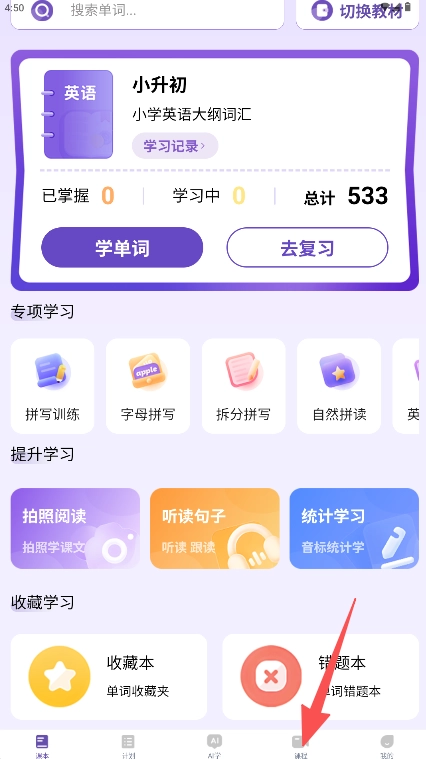 学习路径的设计遵循循序渐进的原则,先从字母拼读入手,接着进行单词记忆,最后落实到例句应用,以此构建起完整的学习闭环。