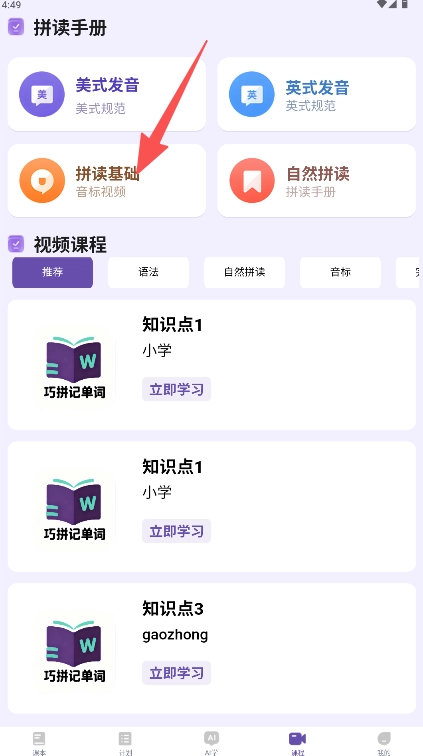 在拼读手册页选择“拼读基础”学习单元。
