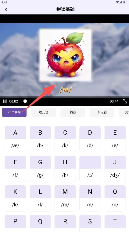 点击“26个字母”开始视频音标拼读练习。