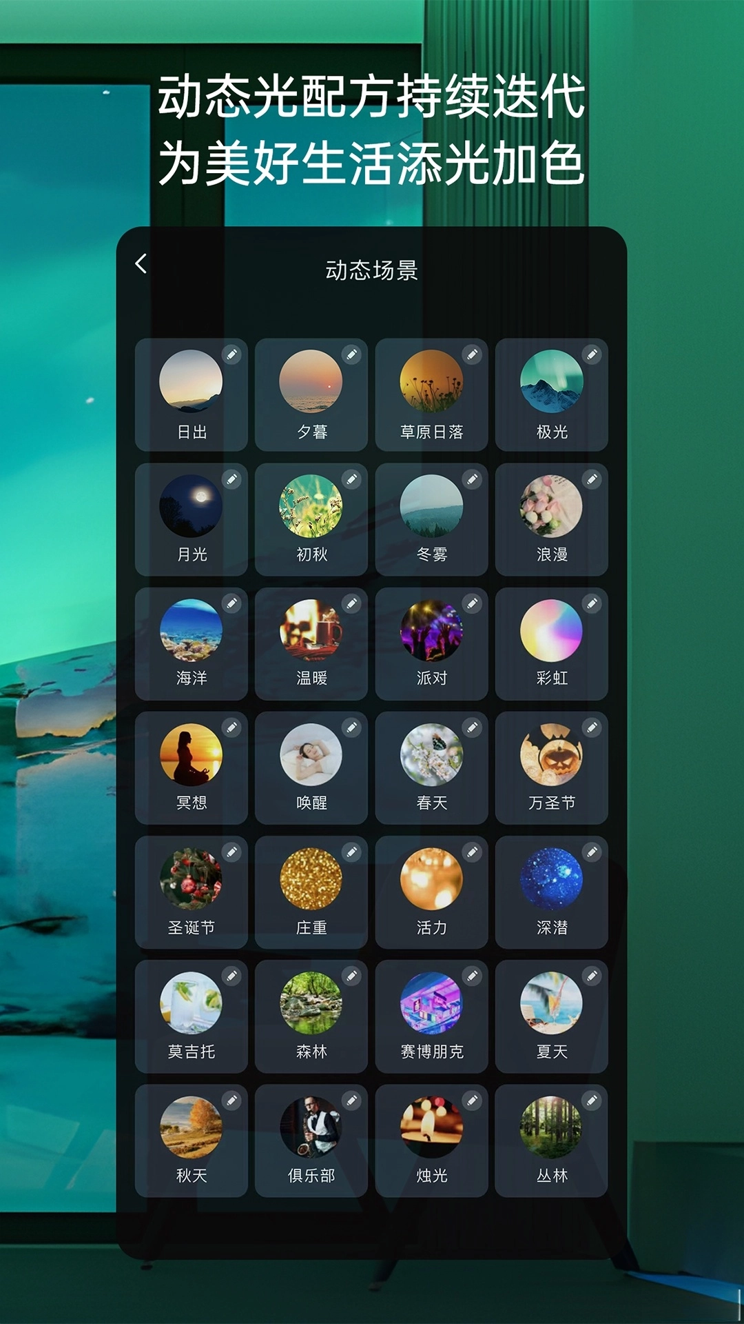 动态光配方:汲取全球各地自然美景的光色灵感,比如挪威极光、丹麦黄昏等,借助动态淡彩光场景来模拟自然光照效果,从而打造沉浸式的情绪体验。