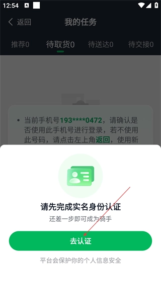 在我的任务页面,点击【上线接单】按钮,进入实名身份认证提示页。