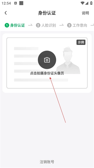 在身份认证页面,点击拍摄区域,拍摄身份证头像页,即可启动身份认证流程。
