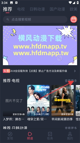进入横风动漫的首页后,若想查看电视类的内容,点击页面上的【查看更多】按钮,就能浏览到更多相关的电视视频。