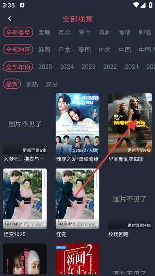 在全部视频页面,能够依据类型、地区和年份对电视内容进行筛选,挑选出像《早间新闻第四季》这类感兴趣的电视节目来观看。