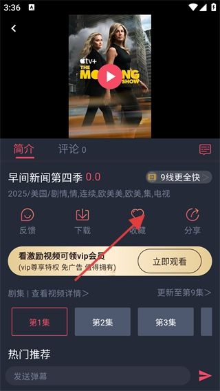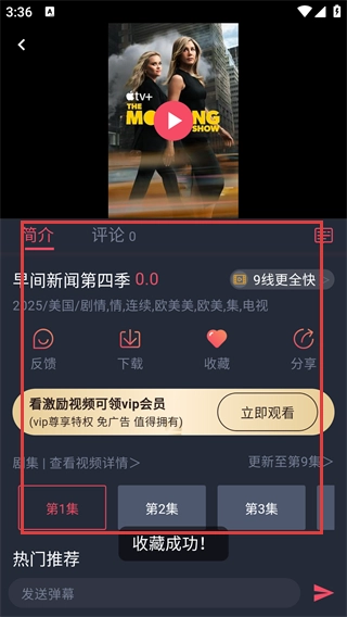 点击进入电视详情页,就能看到评分、简介等相关信息;点击【收藏】按钮,可把该电视内容存到收藏夹里,便于之后再查看。