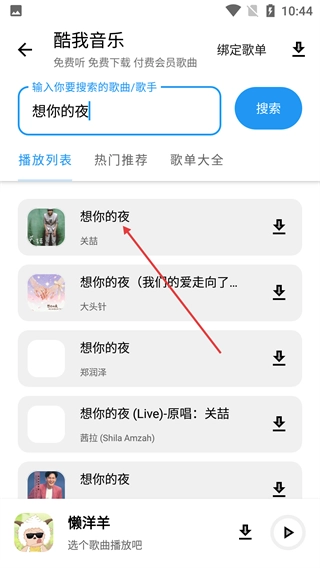在酷我音乐的搜索结果里,找到关喆演唱的《想你的夜》并点击它就可以了。