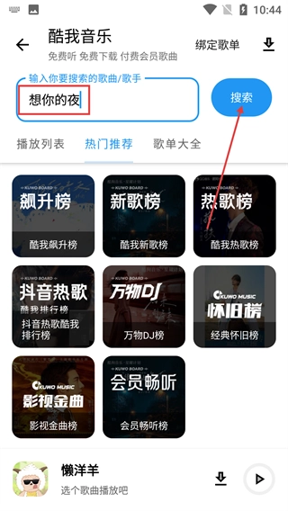 在酷我音乐里,先在搜索框中输入“想你的夜”,接着点击搜索按钮就能完成搜索操作。
